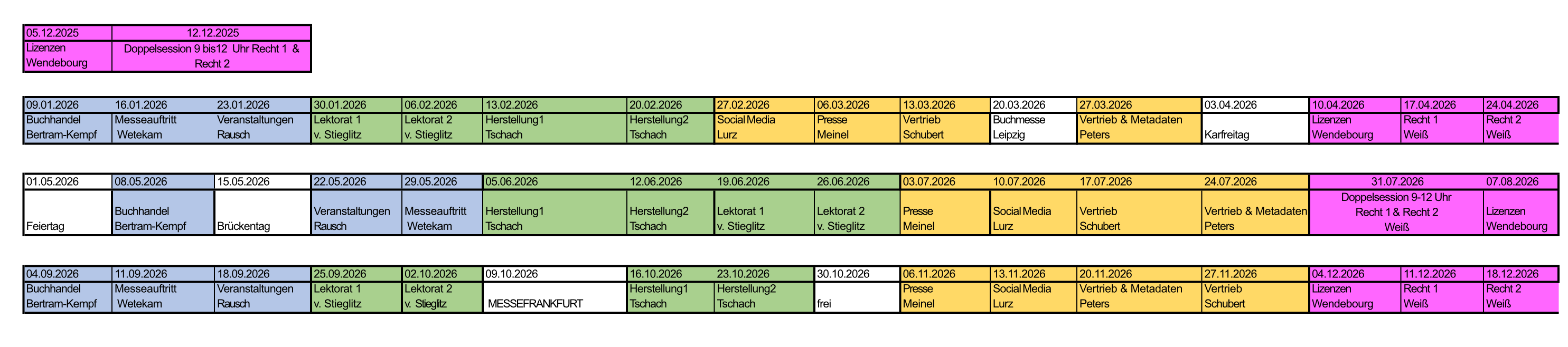 Die Module finden jeweils wöchentlich freitags (mit Ausnahme, z.B. während der Buchmessen) und im rotierenden, wiederkehrenden Modus statt, mit der Möglichkeit für die Teilnehmer*innen auch später – mit Beginn eines neuen Blocks (siehe unten) – neu in die Seminarreihe einzusteigen. Zudem wird es möglich sein, die Aufzeichnung einer verpassten Session im Nachgang via Stream* anzuschauen (*Stream bis zu zwei Wochen lang verfügbar). Durch die verschiedenen Einstiegs- und Nachbereitungsmöglichkeiten können alle Teilnehmenden die 14 Module flexibel durchlaufen – egal, wann ihr Volontariat beginnt oder wie es zeitlich passt. Gebucht werden kann immer nur das Gesamtpaket und keine individuellen Module.